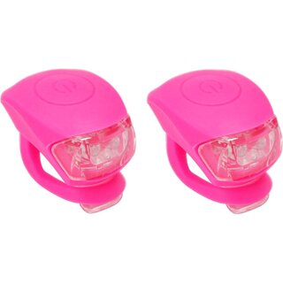 Urban Proof SMD LED Lampen Set - pink. Auffallende LED Radlampen (1 rot, 1 weiss). Sichtbar bis 600m, erhältlich in 13 verschiedenen Farben. Leicht am Lenker oder Sattelstütze zu befestigen. Mit 2 Einstellungen, konstant oder blinkend. Inkl. 4xCR2032 Lithium Batterien.